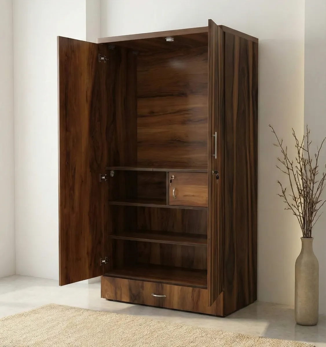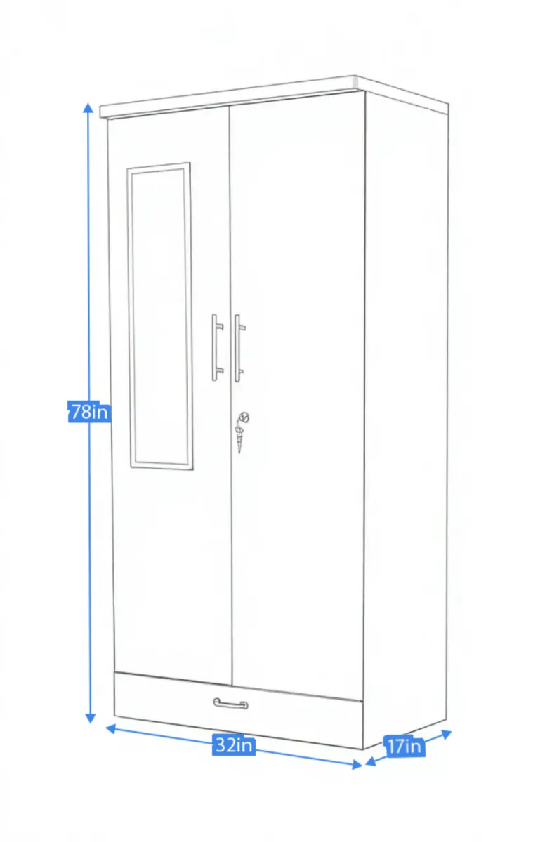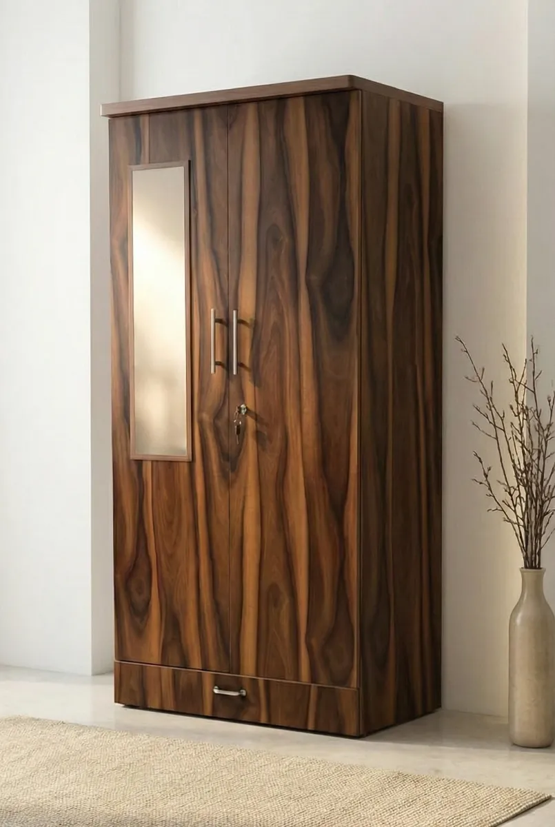 This compact and elegant wooden wardrobe features a rich wood grain finish that adds warmth and sophistication to any bedroom. Designed with two hinged doors and a full-length mirror on one panel, it offers both style and everyday convenience. The spacious interior provides ample room for hanging clothes and storing essentials, while the bottom drawer adds extra organization. Its minimal design and sturdy construction make it ideal for modern and small-to-medium sized bedrooms.