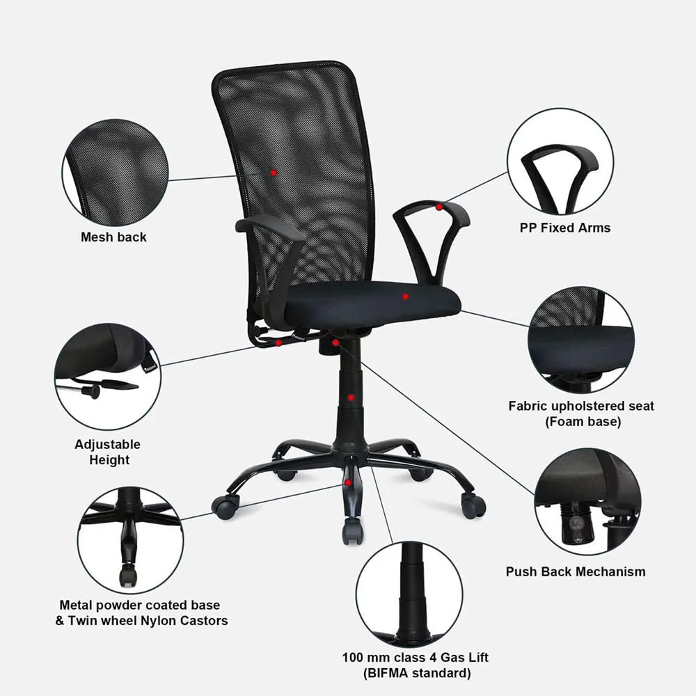 The ergonomic mid-back design offers vital support for your back. Supportive mid-back design ensures optimal comfort Sturdy metal frame provides reliable durability Soft fabric upholstery enhances overall sitting comfort Effortless tilting with a convenient push-back mechanism