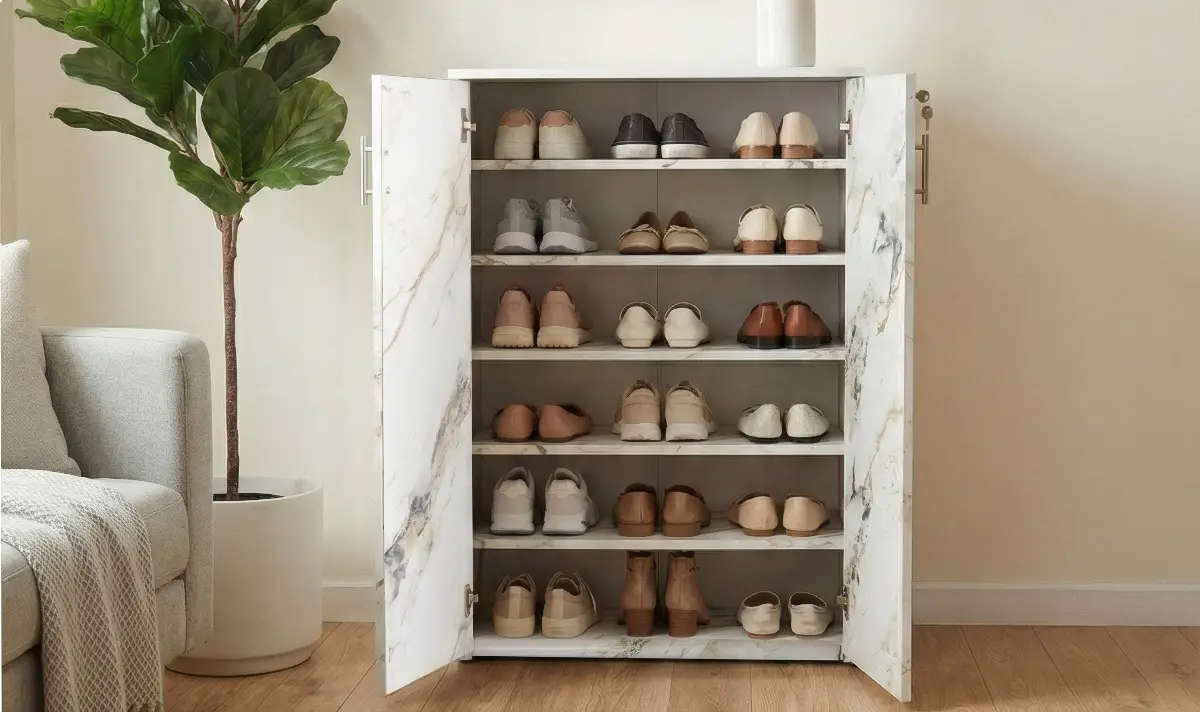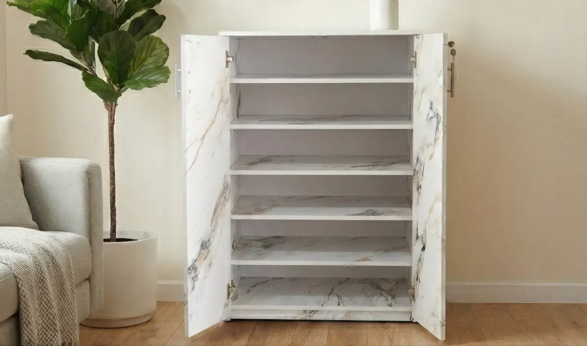 This stylish shoe rack cabinet features a premium marble-finish design that adds a luxurious and contemporary touch to your home. With multiple spacious internal shelves, it provides organized storage for footwear while keeping them dust-free behind hinged doors. Its compact vertical structure makes it ideal for living rooms, bedrooms, or entryways, combining elegance with practical functionality.