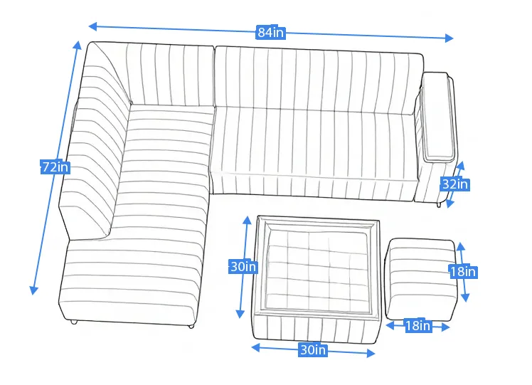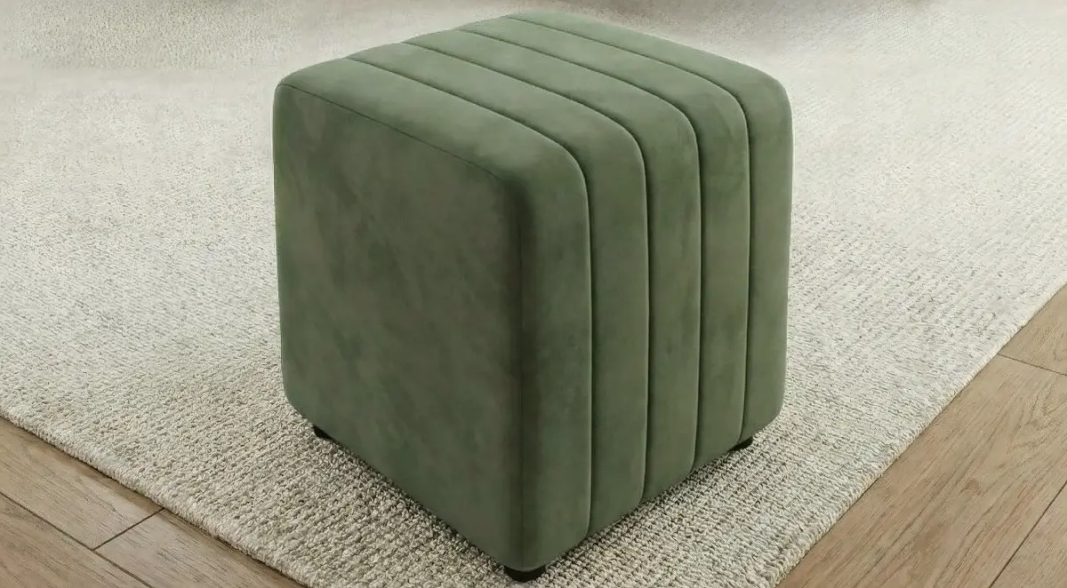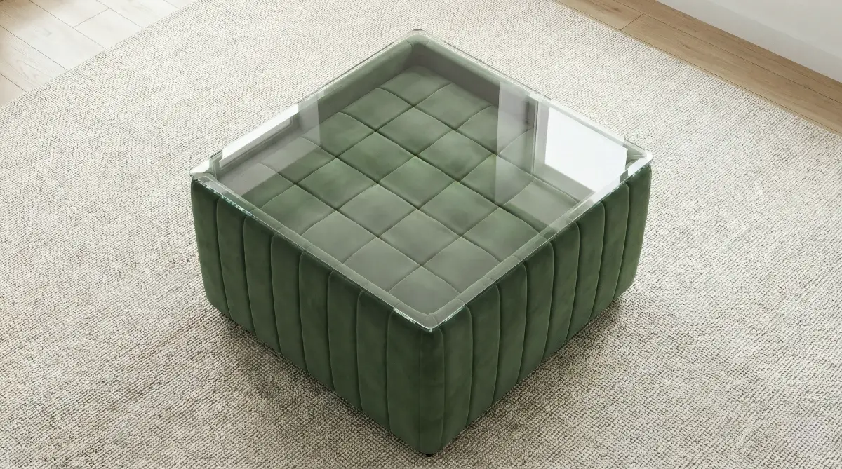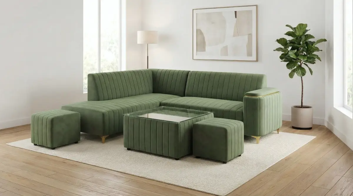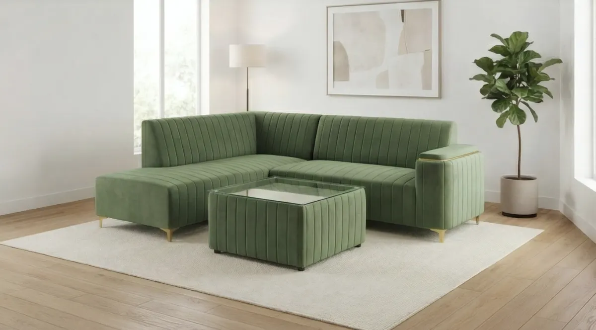 This modern L-shaped sectional sofa set brings a refreshing and elegant look to your living space. Upholstered in a rich green fabric, it features vertical channel cushioning on both the backrest and seating for enhanced comfort and a stylish appearance. The spacious sectional design provides ample seating, while the matching ottoman and cushioned center table with a glass top add functionality and versatility. Perfect for contemporary interiors, this set combines comfort, practicality, and modern aesthetics.