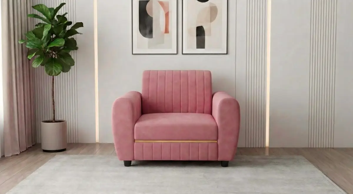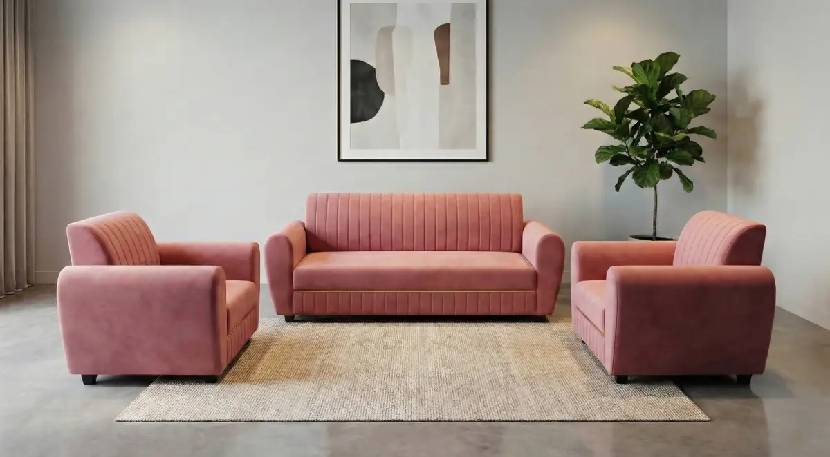 This elegant sofa set features a contemporary design with soft velvet upholstery that adds a luxurious touch to your living space. The three-seater sofa and two matching armchairs are complemented by a stylish cushioned center table, creating a complete and balanced seating arrangement. With vertically channeled detailing on the backrests and plush cushioning, this set offers both visual appeal and exceptional comfort, making it perfect for modern and chic interiors.
