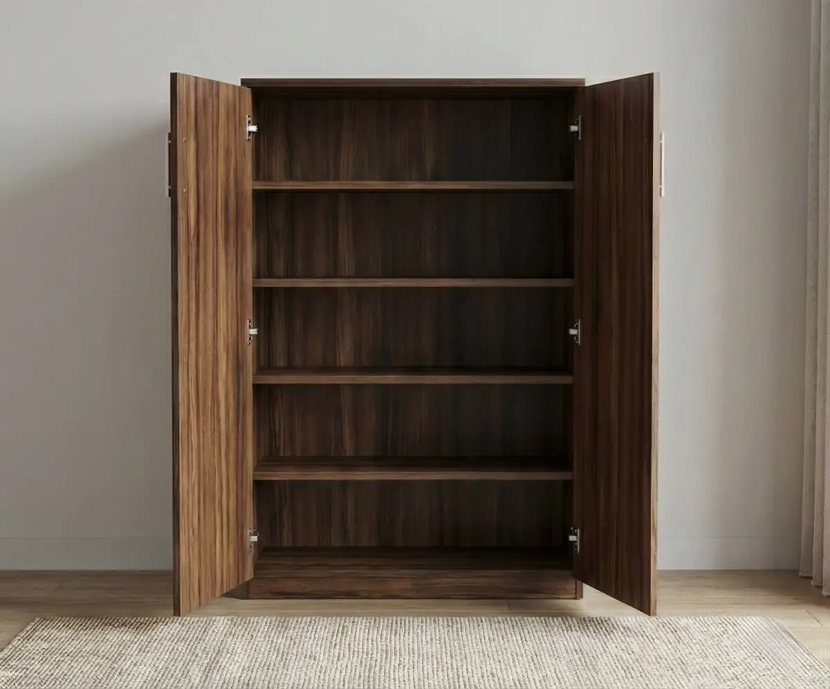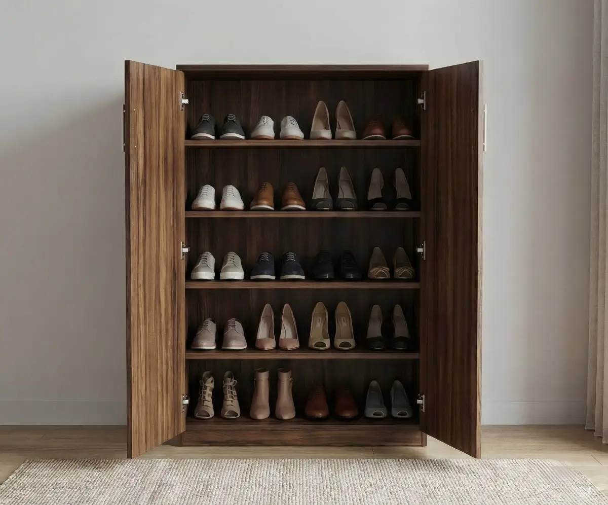 This wooden shoe rack cabinet features a clean and functional design with a rich wood grain finish. It opens with two hinged doors to reveal multiple spacious shelves, allowing you to neatly organize and store footwear of different sizes. The enclosed structure keeps shoes dust-free while maintaining a tidy look in your living space. Its simple and sturdy build makes it ideal for entryways, hallways, or bedrooms.